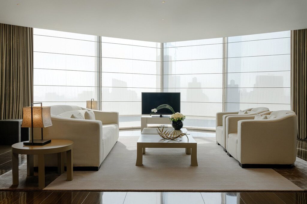 • Ultra-Minimalist Rooms– with floor-to-ceiling views of the Dubai Fountain.